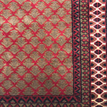 The Surya Veil rug embodies the warmth of first light, with a golden lattice glowing across a deep crimson field. The repeat pattern is delicate yet ordered, recalling carved palace screens where light turns geometry into art. Hand knotted in fine wool, it brings texture, richness, and quiet grandeur to the room.