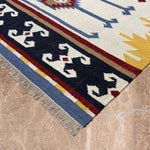 The Taana Safar rug tells a story of movement and memory, where every thread marks a step in a woven journey. Handcrafted in wool, its diamond medallions and arrow motifs unfold across an ivory field, bordered by tones of mustard and indigo. The rhythm of its design mirrors the steady flow of travel — grounded, deliberate, and timeless.