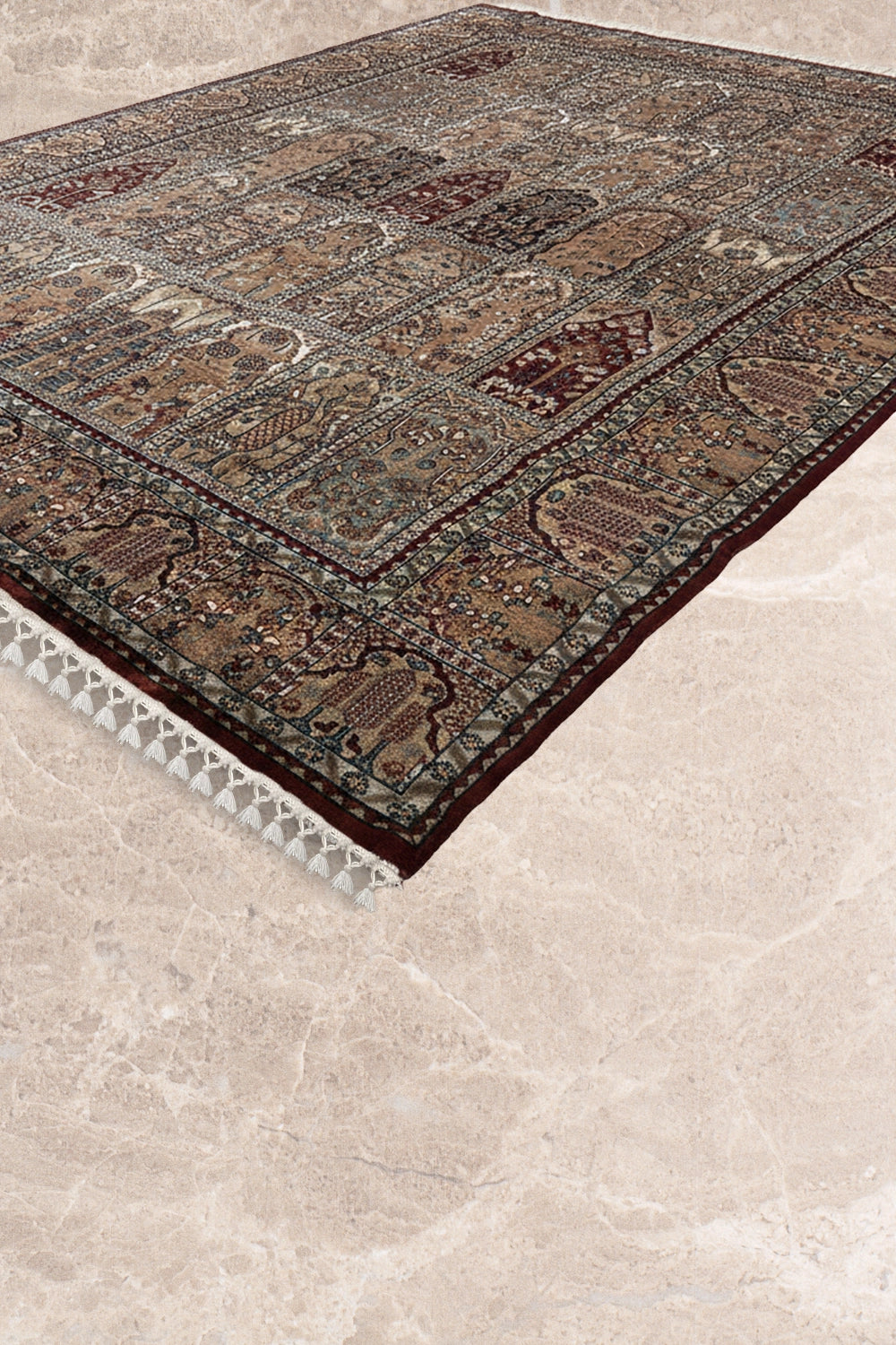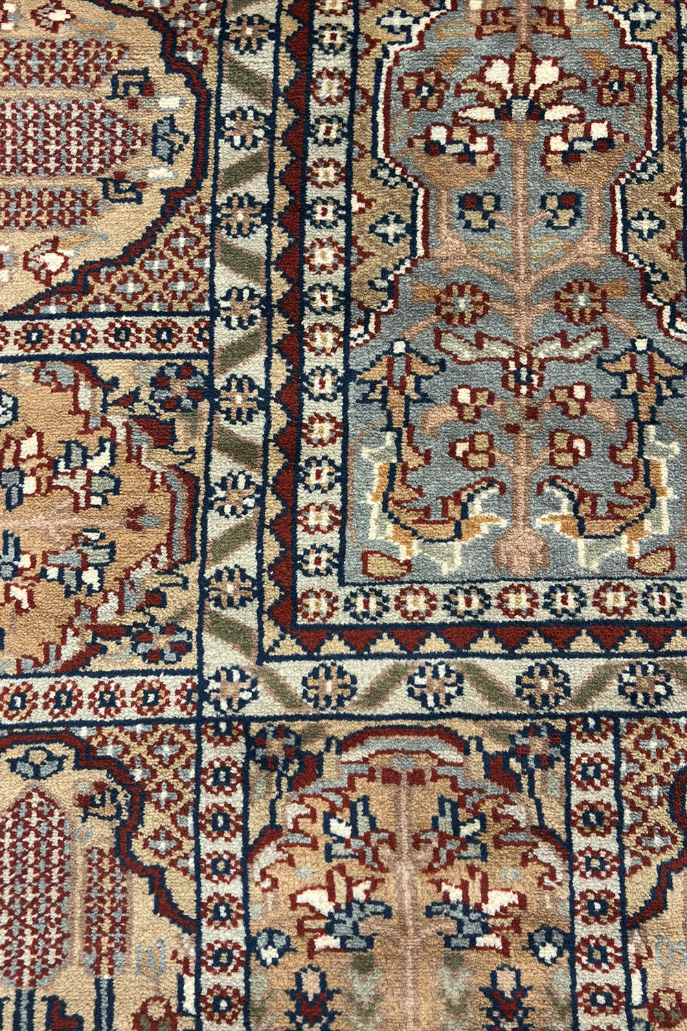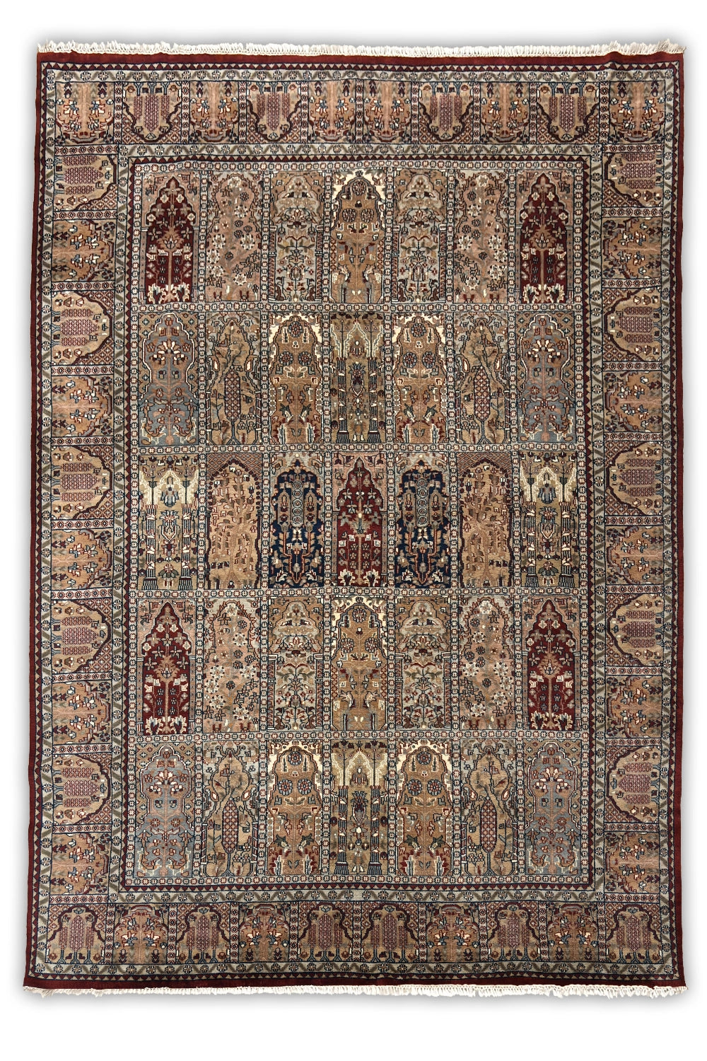 Tassavur is a richly detailed traditional oriental rug composed as a tapestry of repeating architectural panels and delicate floral motifs. The structured grid-like layout evokes the imagery of arched niches and palace walls, creating a sense of depth, order, and storytelling across the surface.