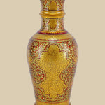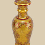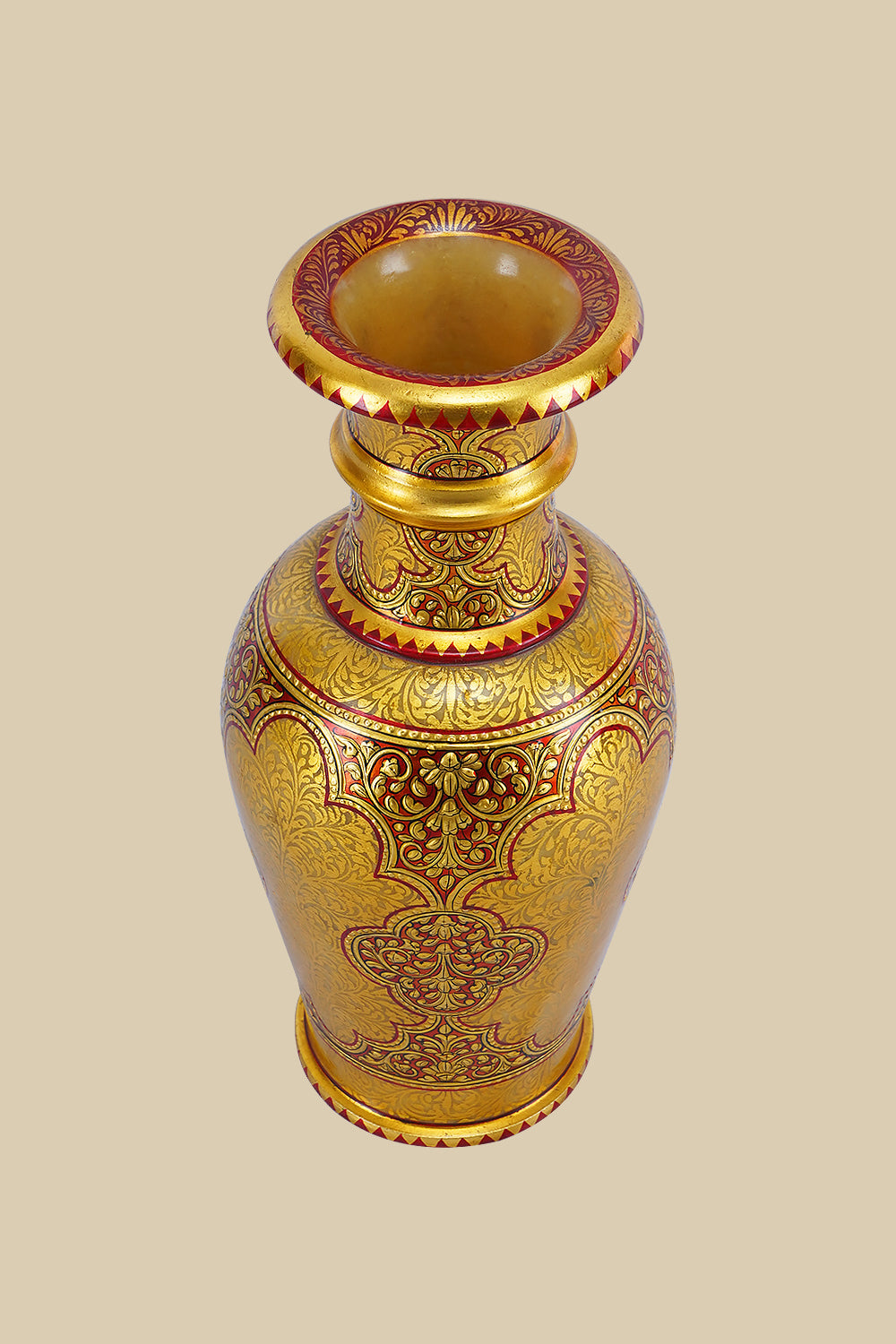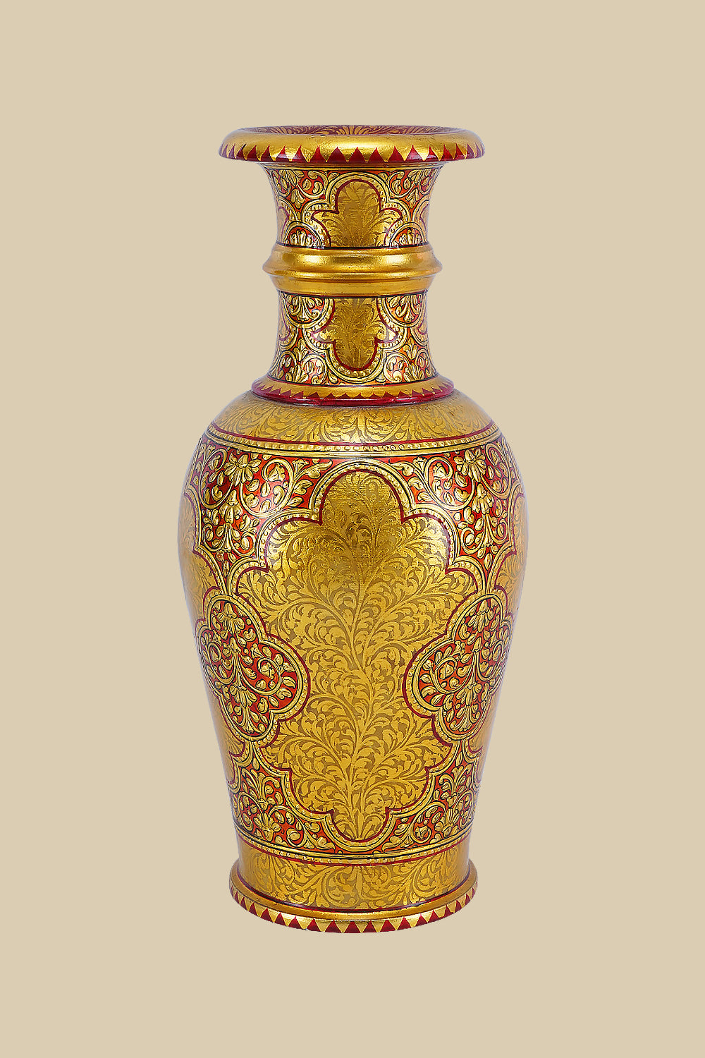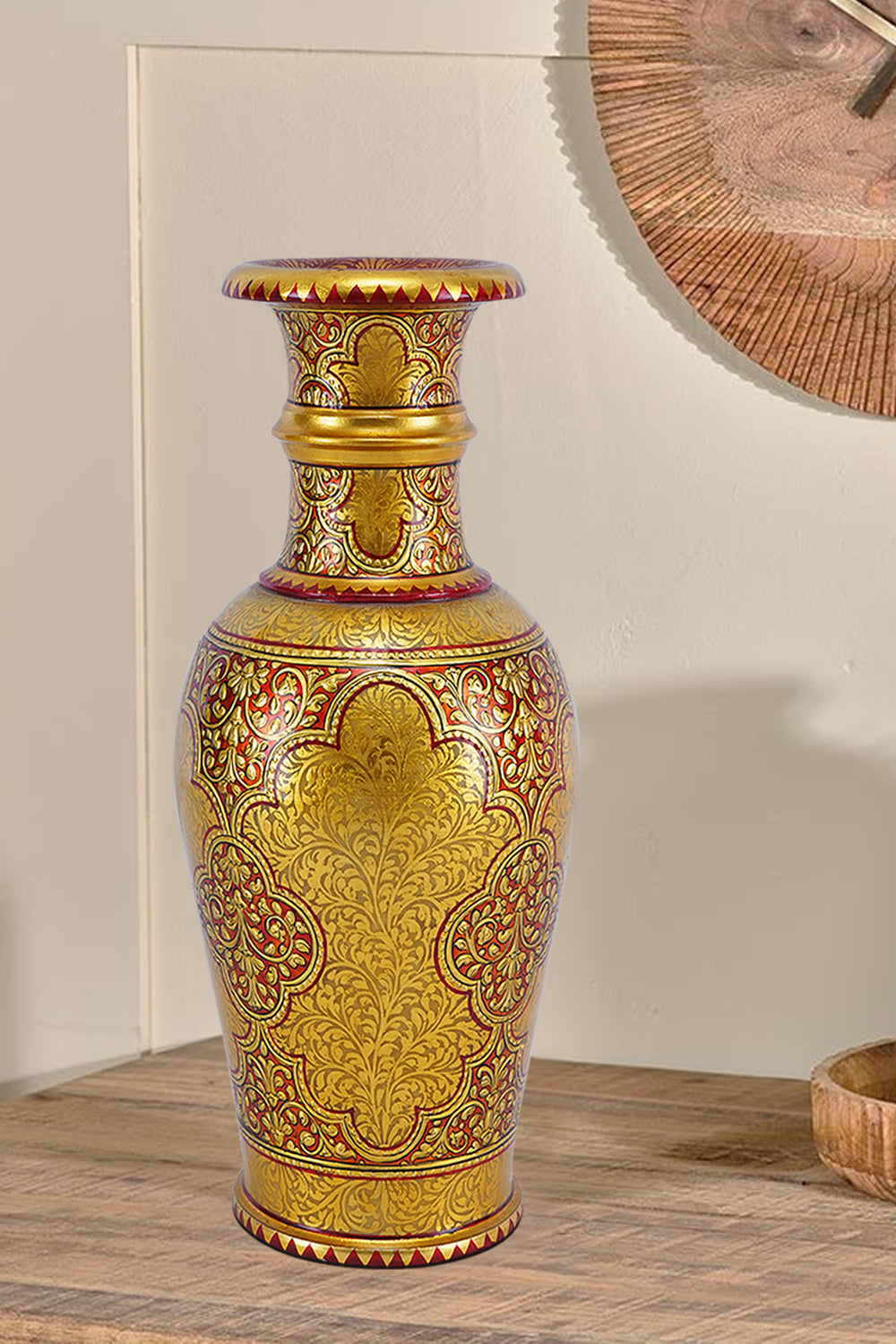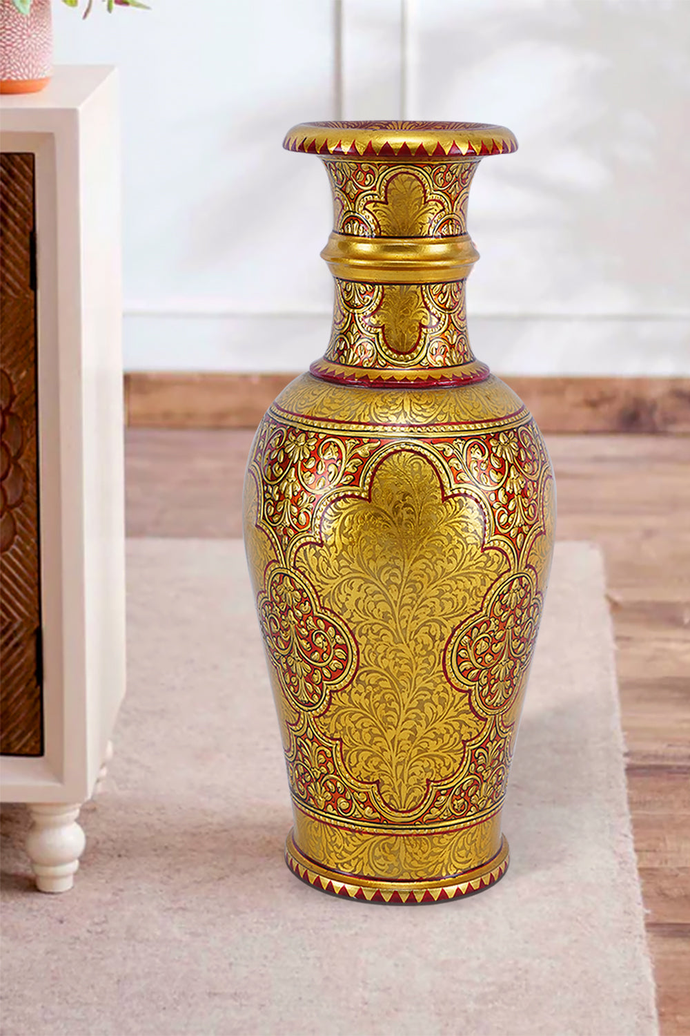 The vase is predominantly a warm, golden hue, complemented by rich red accents. The gold, applied with meticulous precision, adds a touch of opulence and highlights the intricate details of the floral motifs. It is a true masterpiece that will surely be admired by all who behold it, enhancing the decor of any living space and adding a touch of luxury and sophistication. It is also a treasured heirloom to be passed down through generations, preserving a piece of Indian heritage.