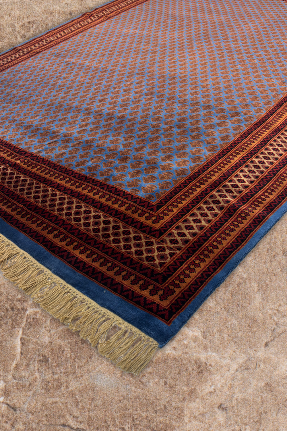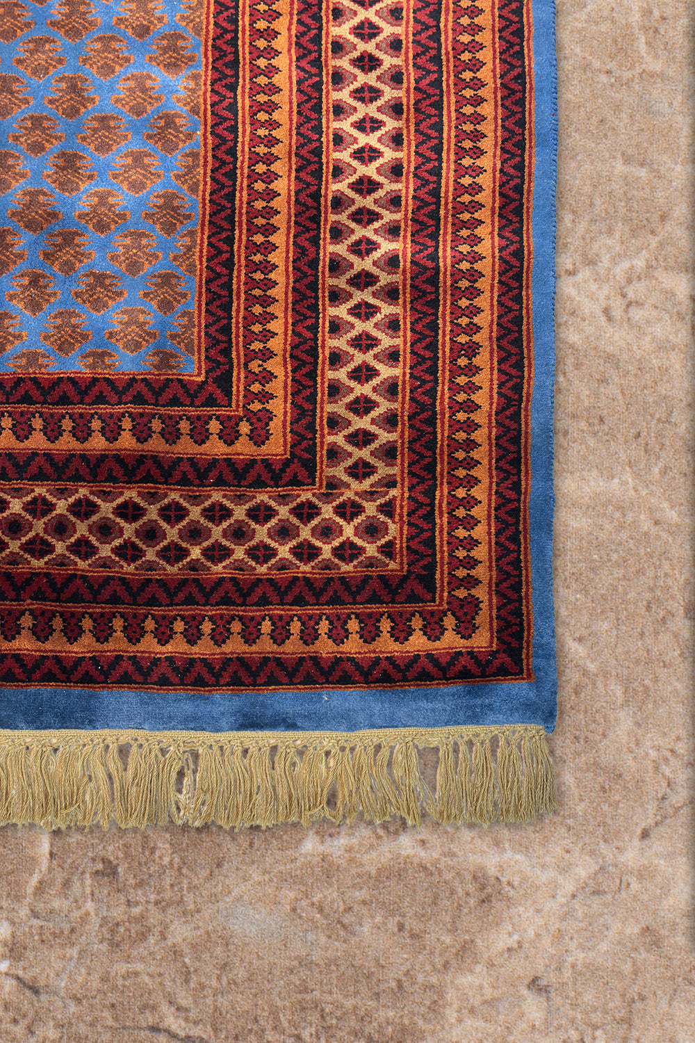 The Veylan rug is a dialogue between cool refinement and earthy warmth. Its cobalt blue field is adorned with delicate lattice motifs, framed by bold rust brown borders that give the design depth and balance. Each hand knotted thread reflects the mastery of artisans whose craft transforms geometry into timeless artistry.
