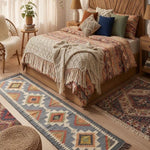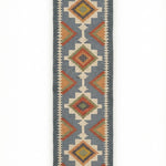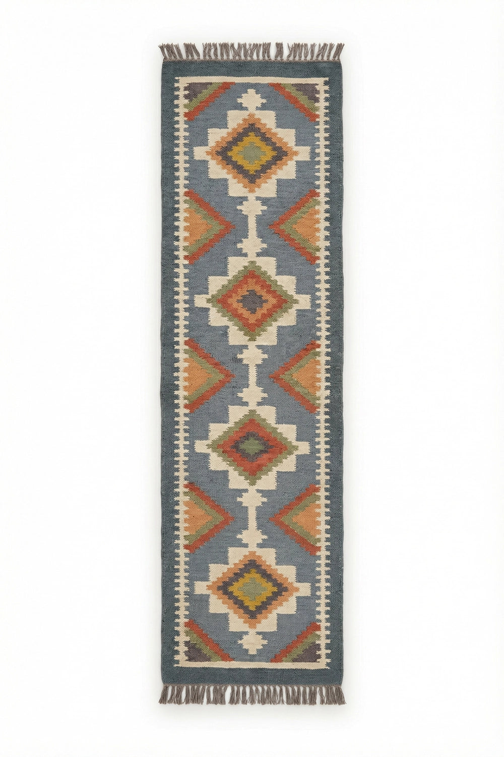 Waymark is a modern kilim runner defined by bold geometric motifs arranged in a steady, linear rhythm. The repeated diamond forms echo traditional wayfinding symbols, creating a sense of movement and direction along the length of the rug.