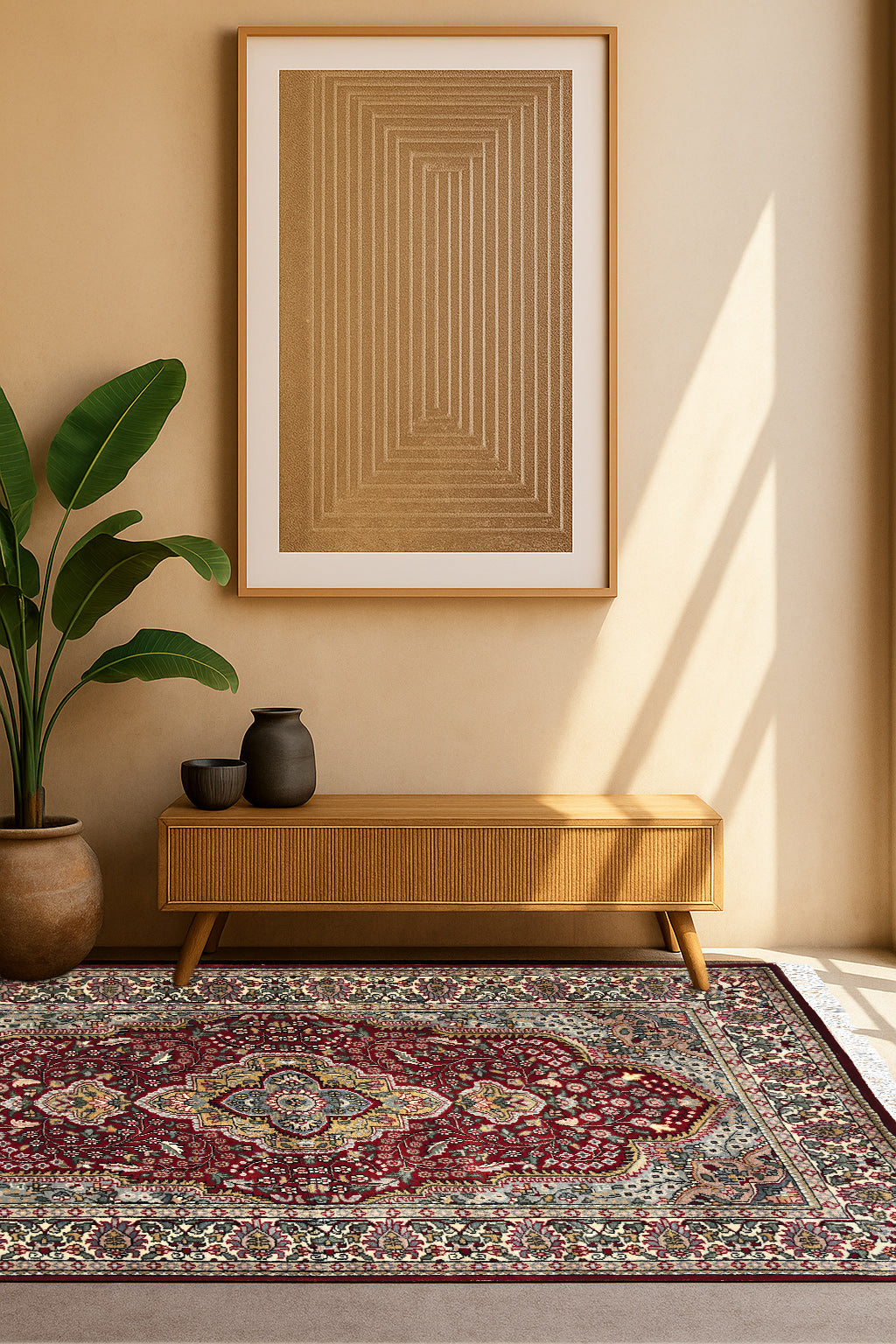 Perfect for living rooms and bedrooms, Yamira adds warmth and sophistication to the home. The crimson tones infuse depth and character, while the ivory detailing creates lightness and balance. A piece of cultural storytelling, this rug is more than décor—it is a woven heirloom designed to enrich interiors with grace.