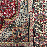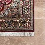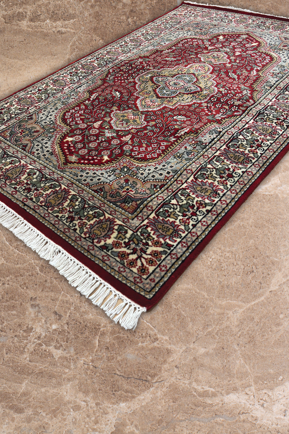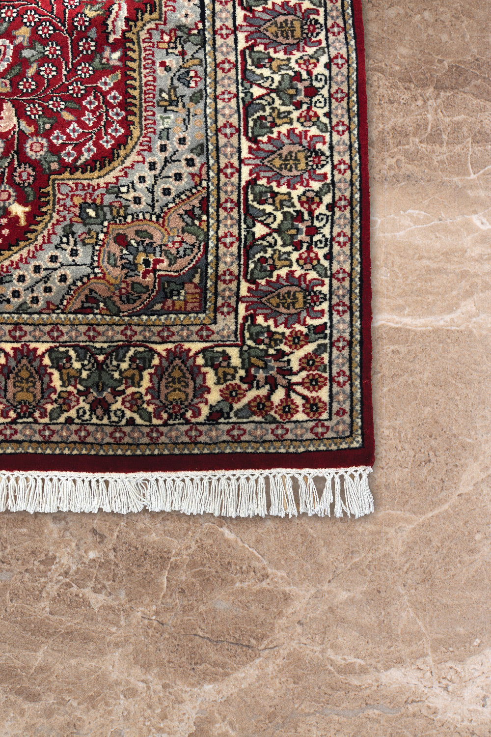 The Yamira rug is a timeless expression of heritage, where a deep crimson field meets the gentle elegance of ivory cream borders. Its central medallion blooms with intricate floral patterns, hand knotted in fine wool by skilled artisans. Each motif reflects centuries of design tradition, balanced in symmetry and colour.