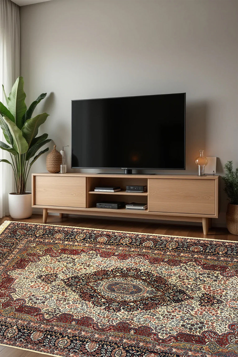 With its intricate detailing and regal symmetry, Zahra Mahal brings timeless sophistication to any setting. The ivory hues open and brighten a space, while the brown borders lend grounding warmth — creating a perfect balance of luxury and comfort.