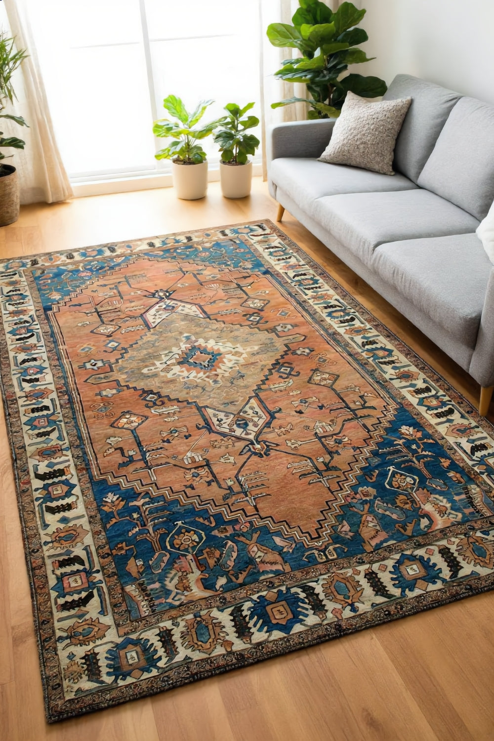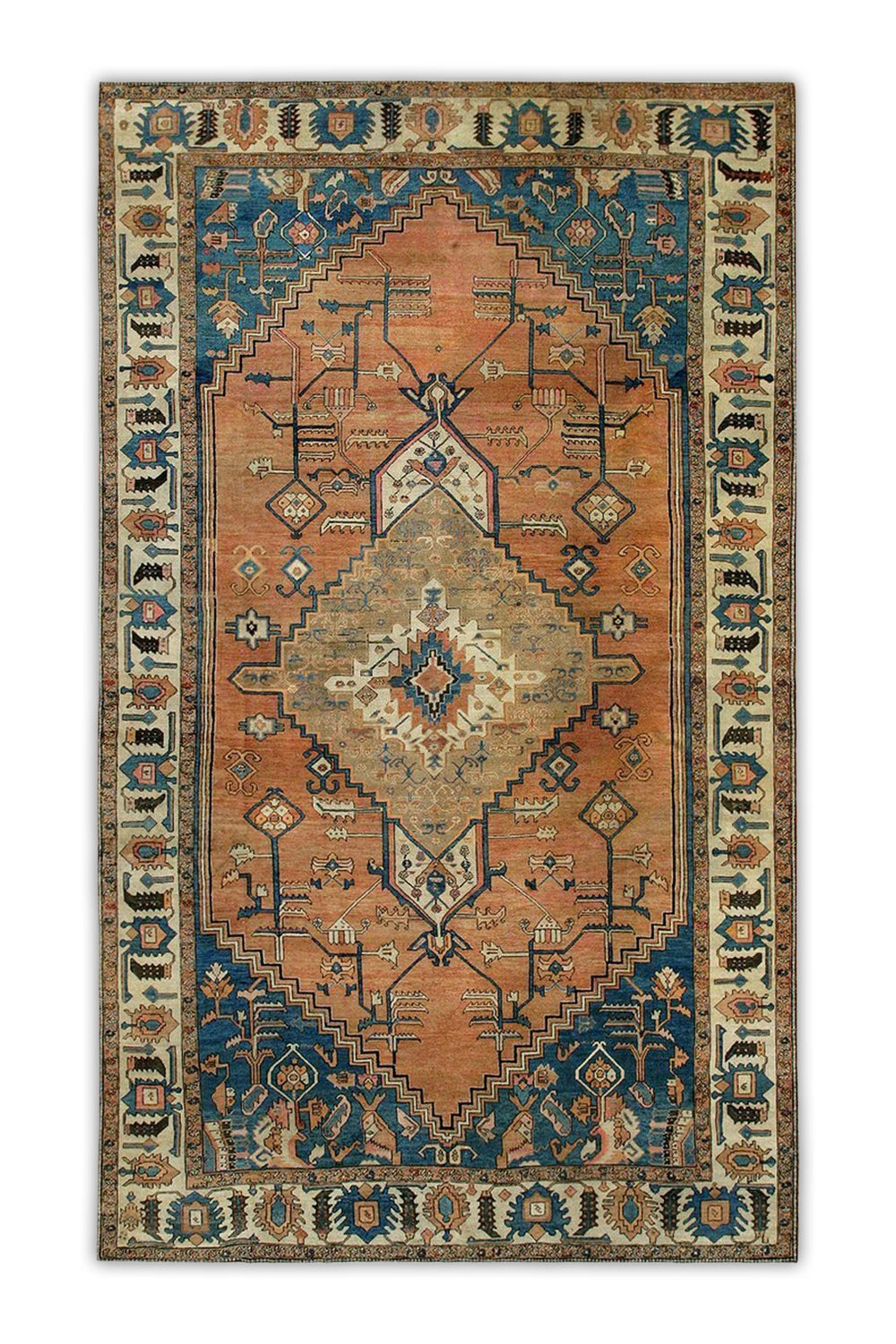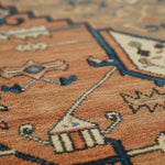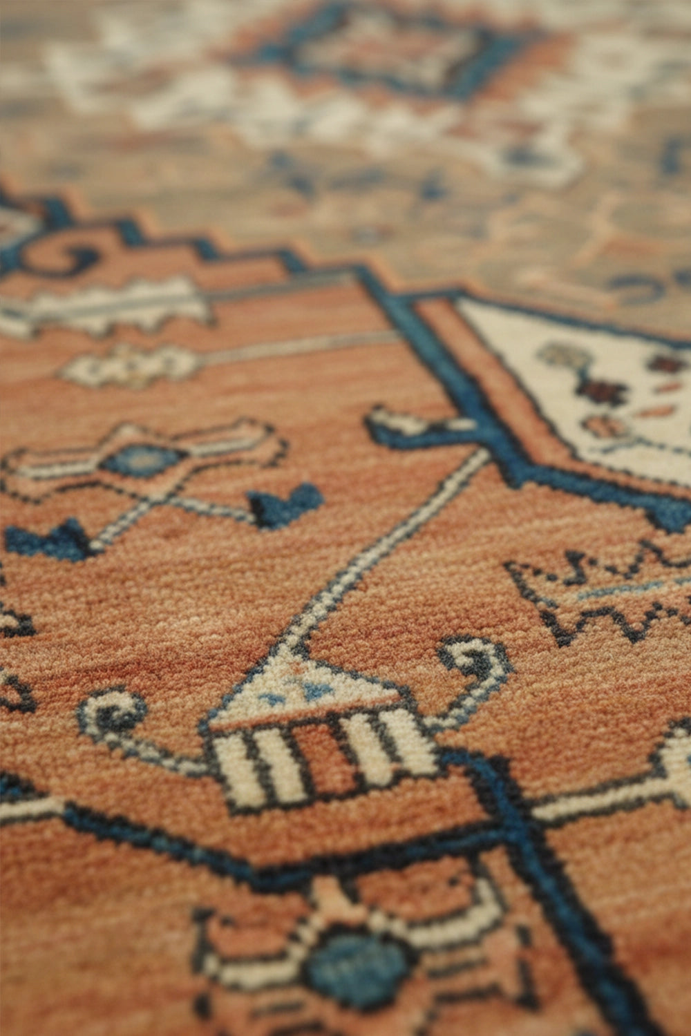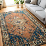 Zarif Dalan is a traditional tribal rug defined by its strong central medallion and stepped geometric forms, echoing the rhythm of ancient mountain pathways and desert architecture. Warm terracotta tones are balanced by deep teal and soft mineral accents, creating a composition that feels both grounded and quietly expressive.
