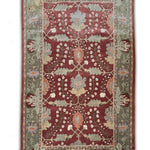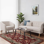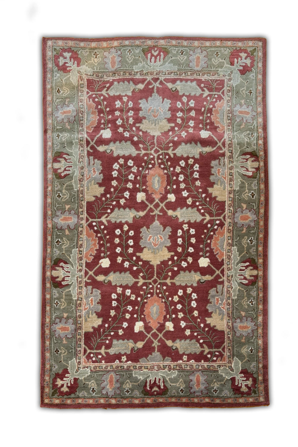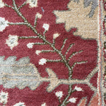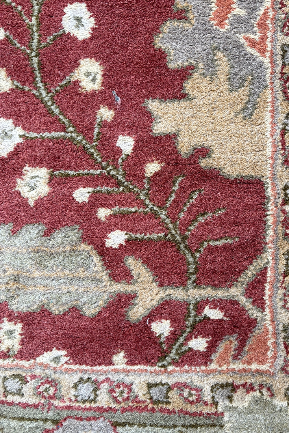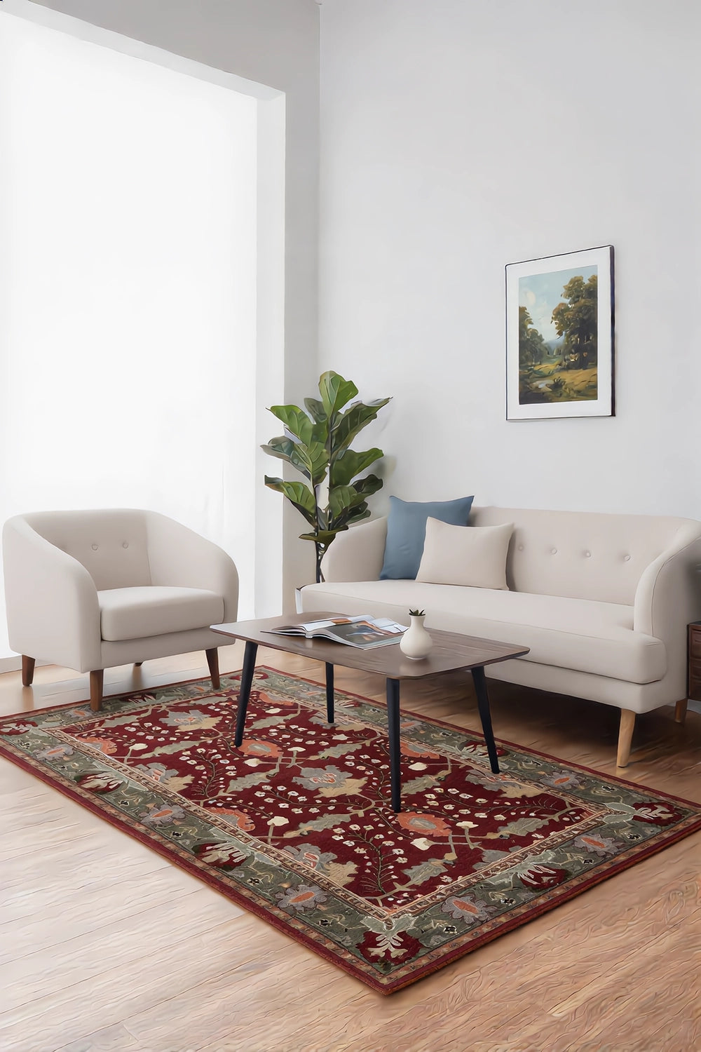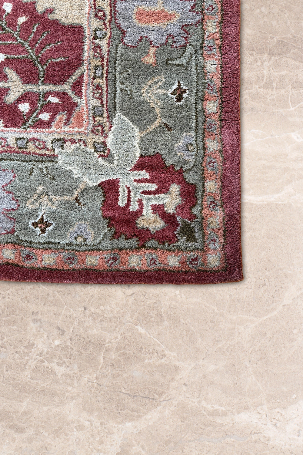 Hand-tufted in wool with a soft, high pile, this rug offers warmth and visual richness underfoot. The deep maroon ground, layered with sage green and muted ivory accents, makes it an elegant statement piece for living rooms or bedrooms where traditional craftsmanship and comfort are equally valued.